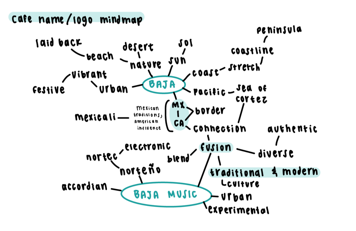 Visual research explored design elements, imagery, and motifs associated with Mexican and Baja California music scenes, alongside case studies of venues/cafes. These insights informed the concept of a space that evolves throughout the day.