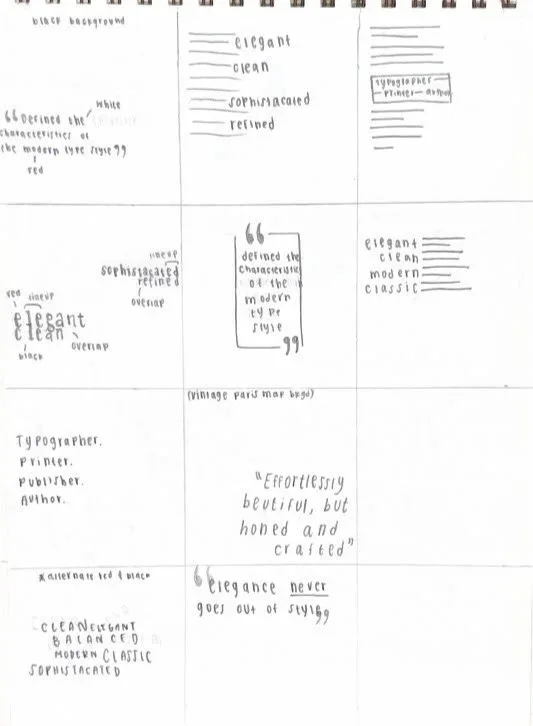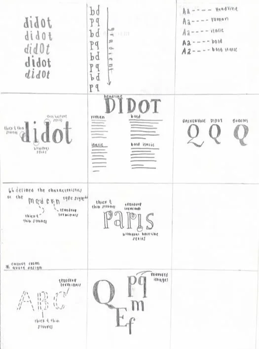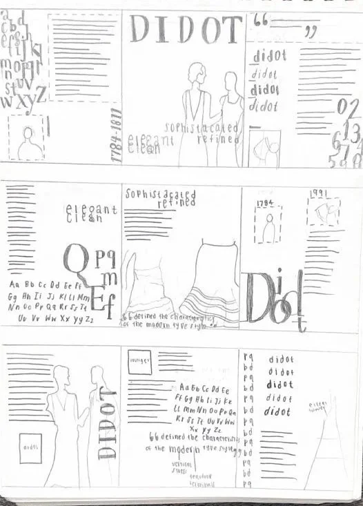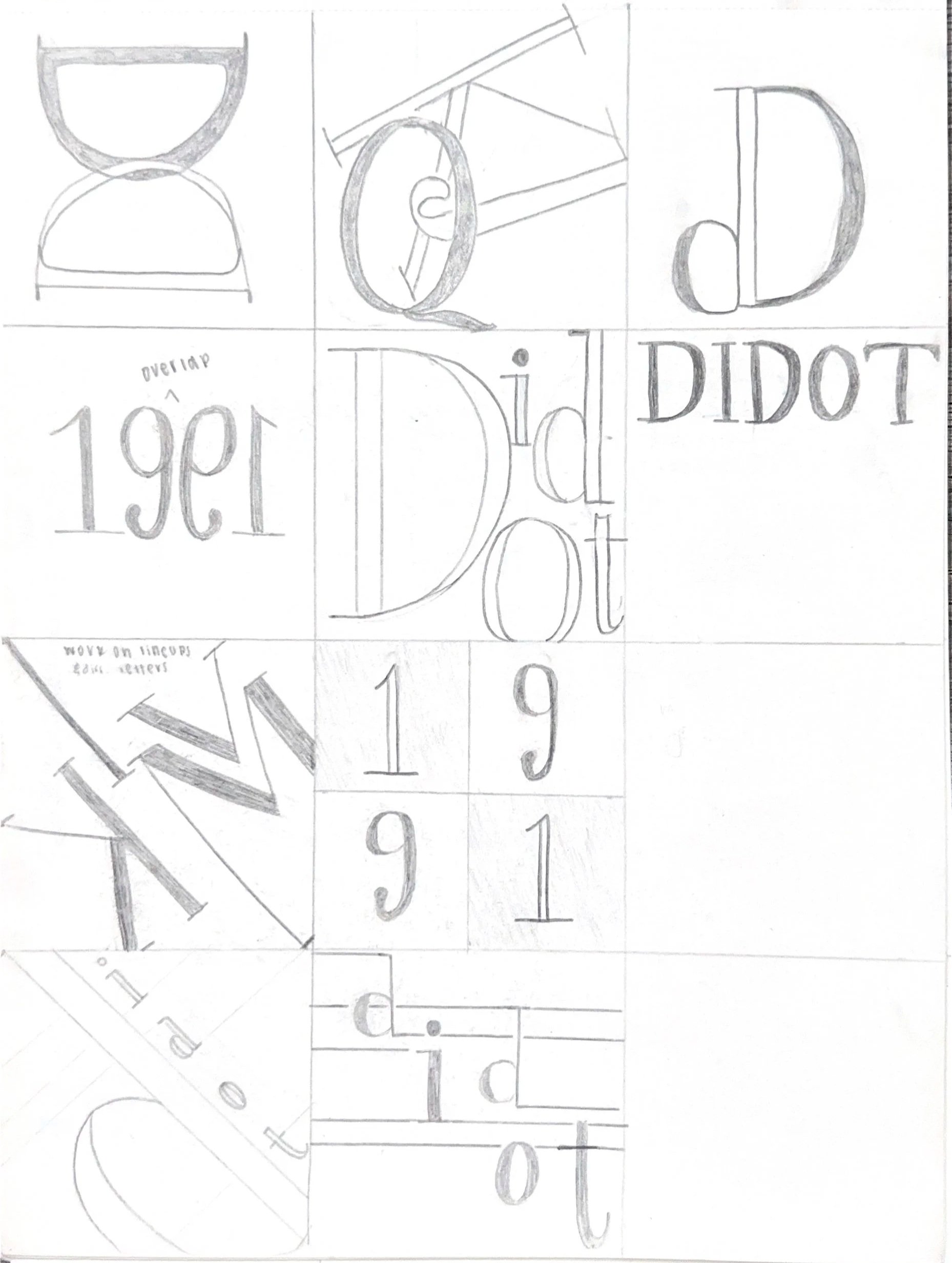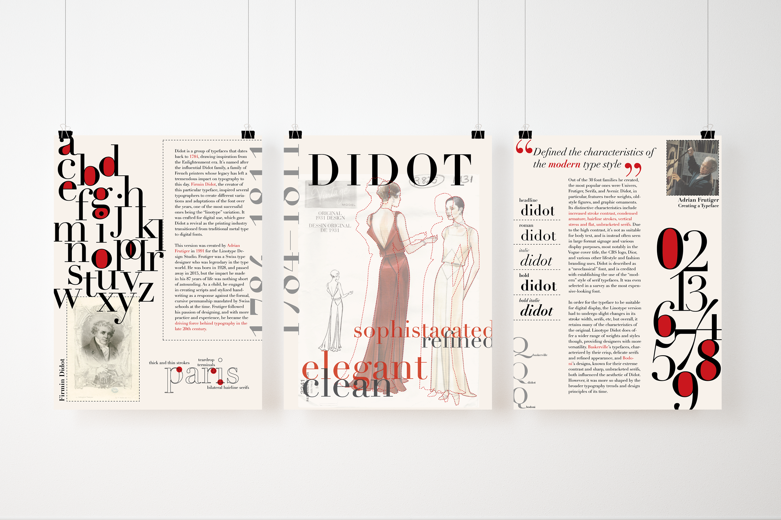 I decided to create a series of posters showcasing the timeless elegance of the Didot font. It’s used for Vogue and has been around since 1784, so I reflected that in my designs by taking a vintage approach that also represents its fashionable uses, drawing inspiration from vintage sewing patterns and magazine layouts. After exploring different designs through type as image, quotes, alphabet showcases, and typographic specimens, I combined my favorites and made a triptych poster.