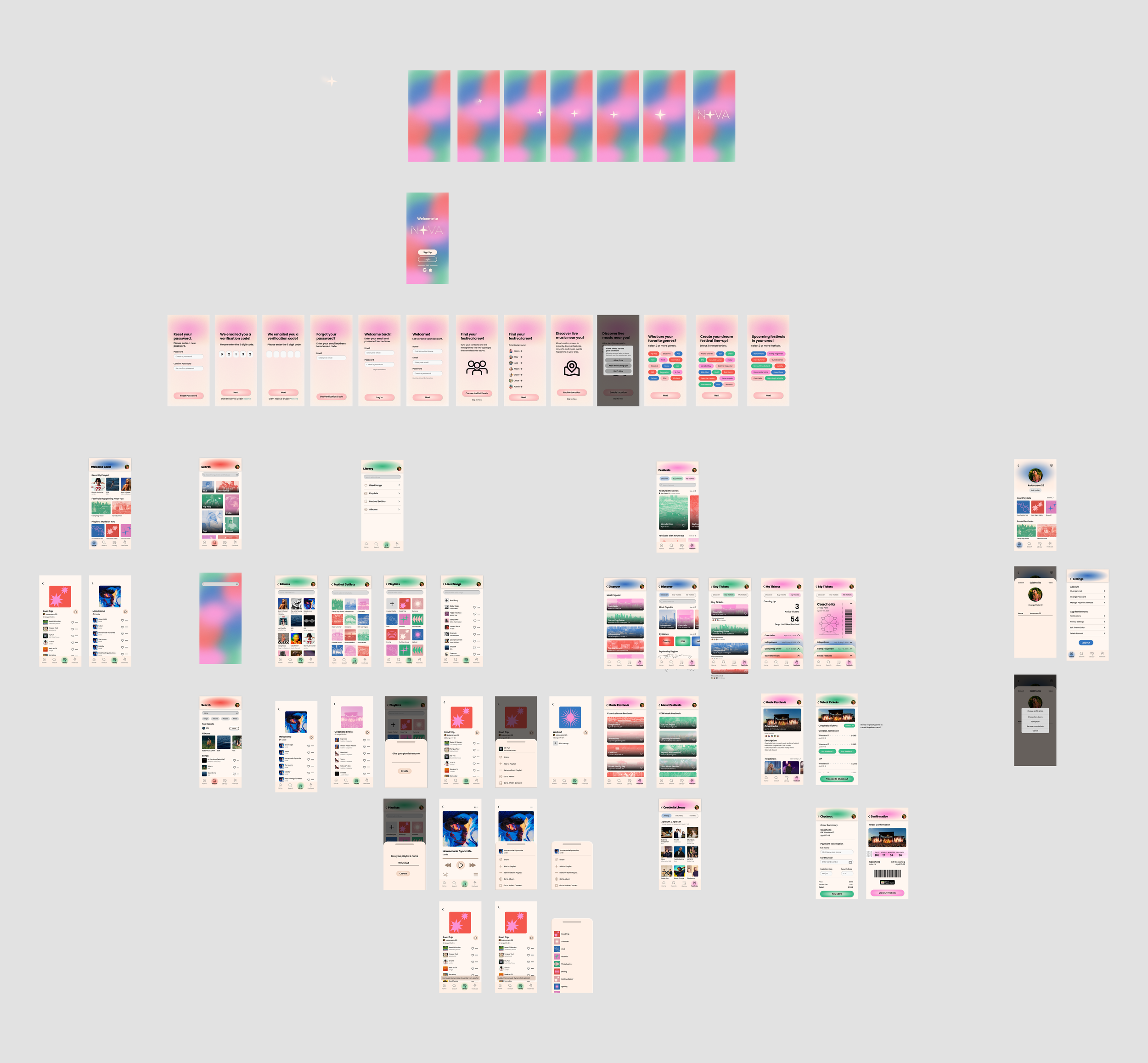 Nova is a mobile app that combines music streaming, personalized playlists, social features, and festival discovery into one seamless experience. Its standout feature is an integrated festival hub where users can browse and purchase tickets directly, bridging digital listening with live events. Targeted at tech-savvy users aged 15–40, Nova competes with Spotify and includes key flows like sign-up, playlist creation, and festival ticket purchasing.