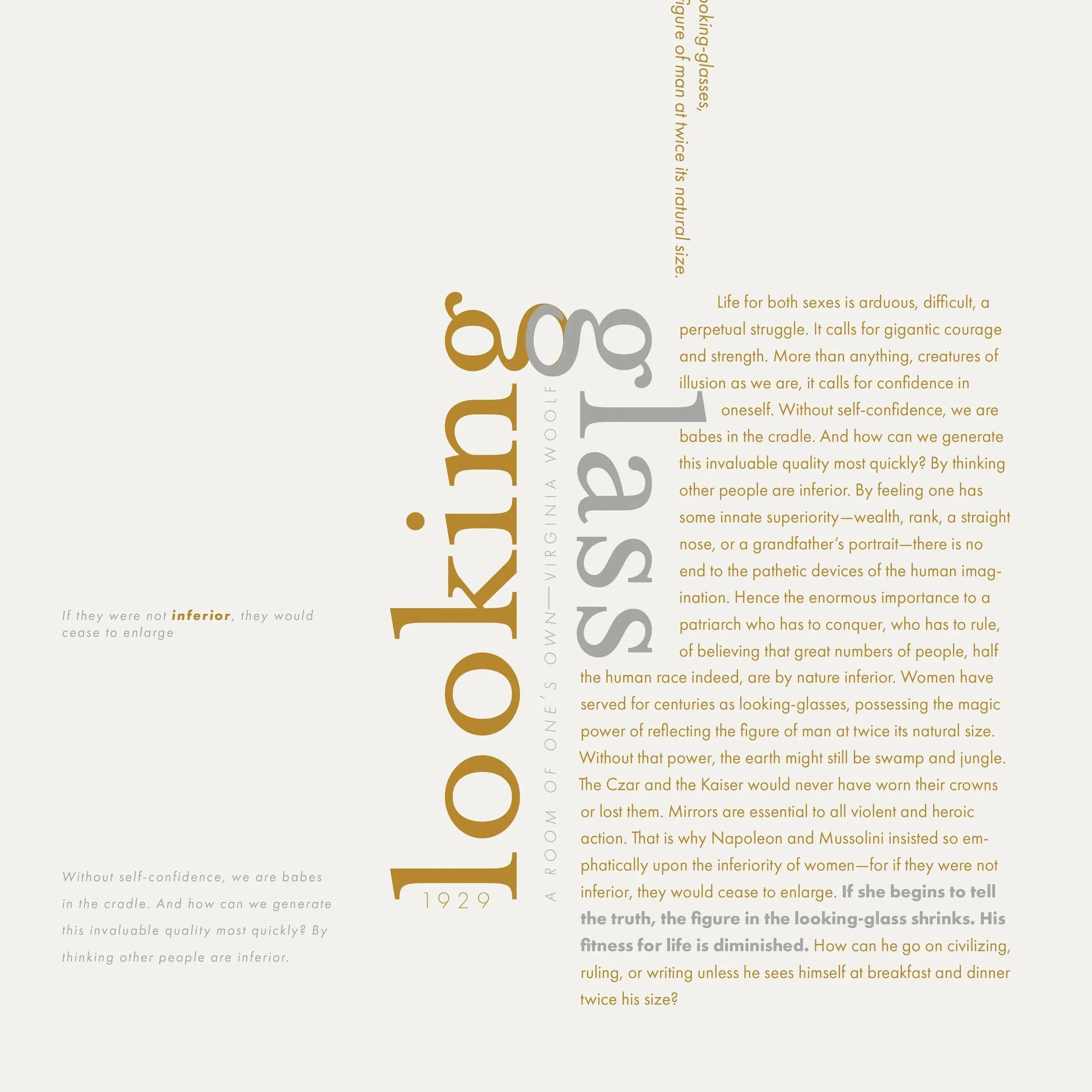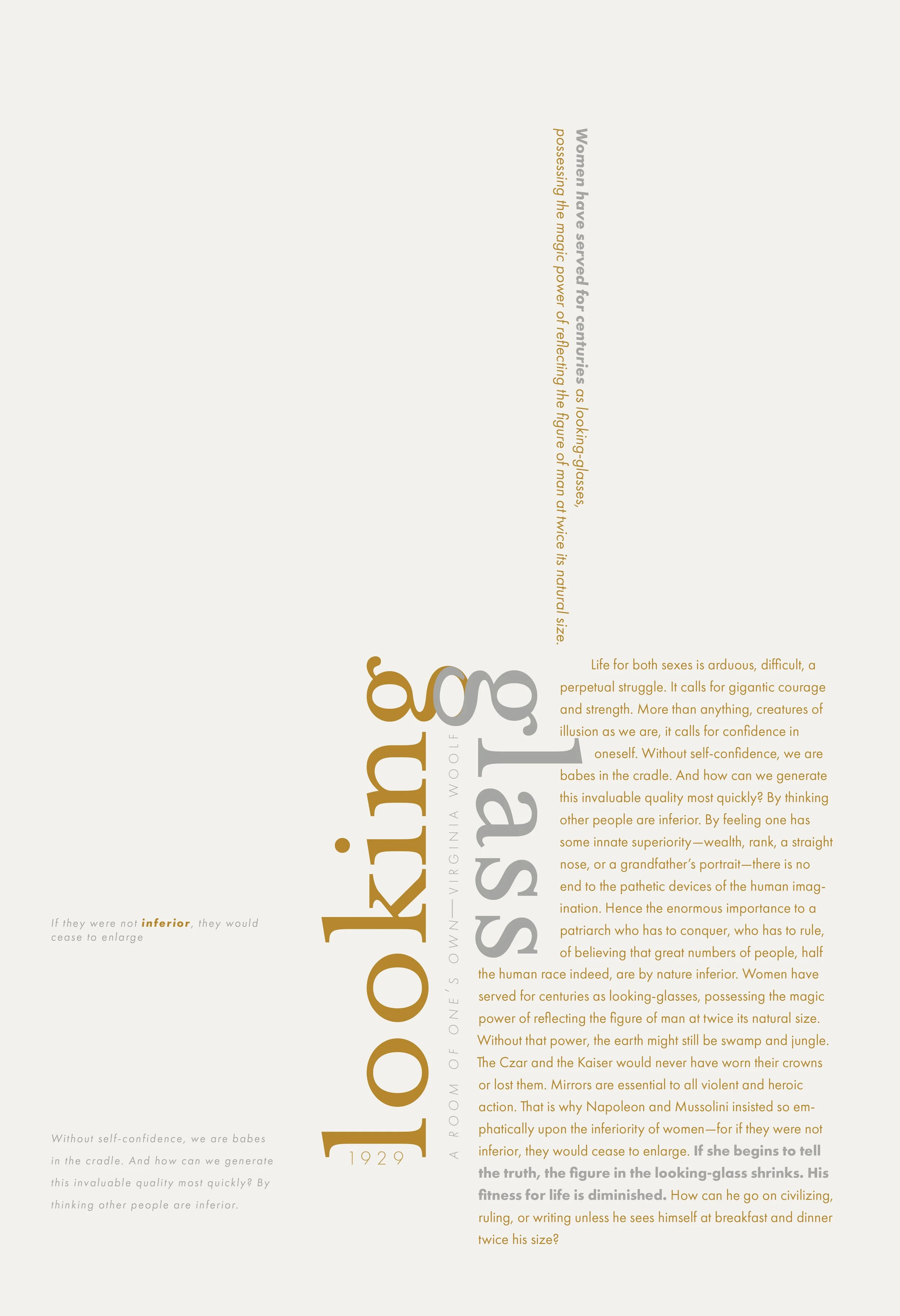 The objective of this project was to design two broadside posters based on my interpretation of an excerpt from Virginia Woolf’s, A Room of One's Own, in which she reflects on how society has shaped gender roles and power dynamics. She critiques the patriarchal system, suggesting that it relies on illusion and distortion, and challenges the idea that power should be built on such false perceptions. I selected the key operative word "looking glass," which connected to the core meaning of the excerpt, and developed a logotype to highlight it. Through concept development, image selection, typographic treatment, and color choices, I aimed to enhance the speech’s message and deepen the audience’s understanding of its meaning.
