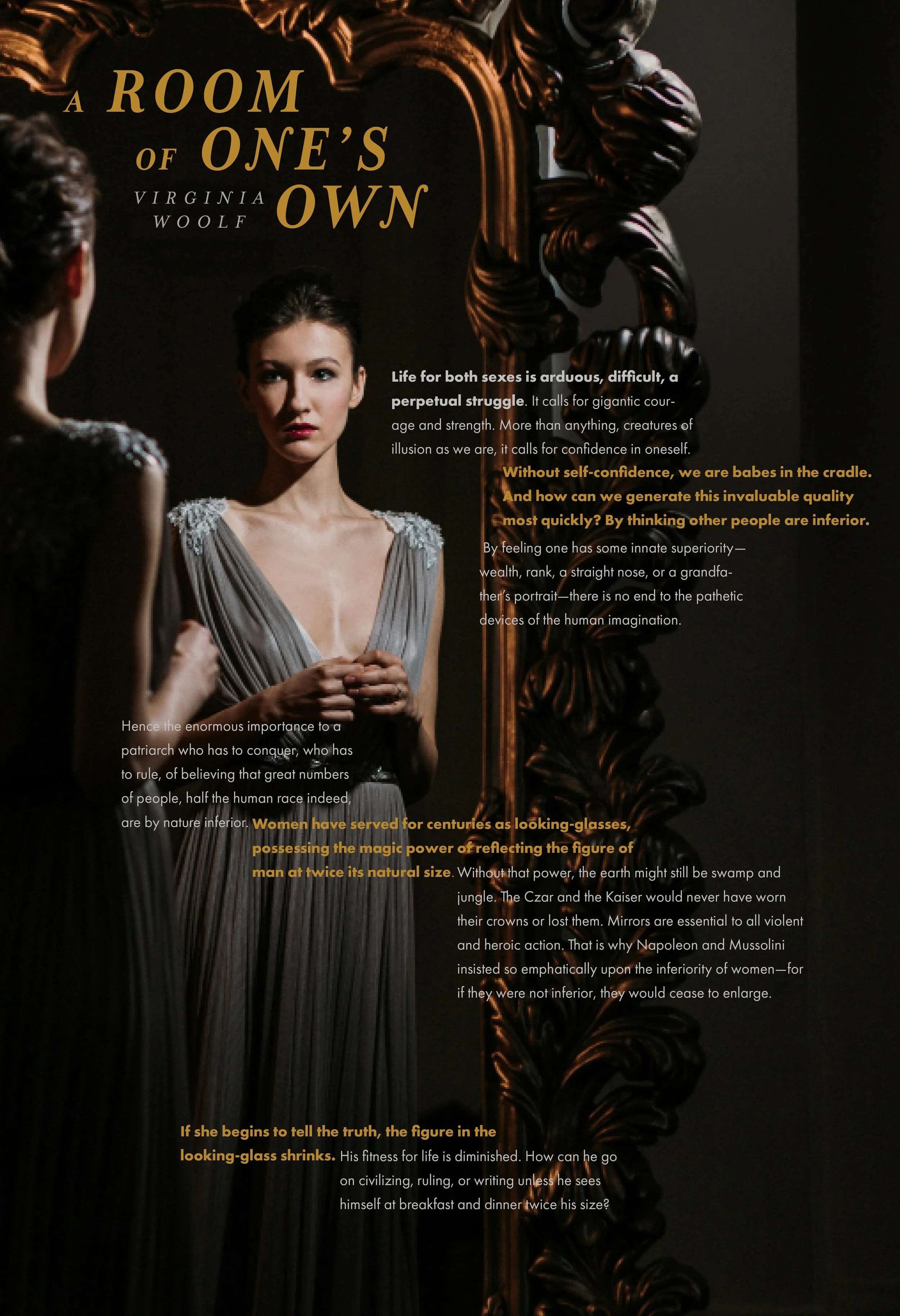 I selected a gold, silver, and off-white palette to visually reflect the ideas in Woolf’s passage: Gold symbolizes power, dominance, and the illusion of greatness—historically associated with rulers, wealth, and divinity. This aligns with the inflated self-image Woolf critiques. Silver represents reflection and femininity, alluding to women’s historical role as mirrors that amplify men’s sense of power. Off-white introduces neutrality and clarity, serving as a blank slate for reimagining narratives beyond illusion and tradition.