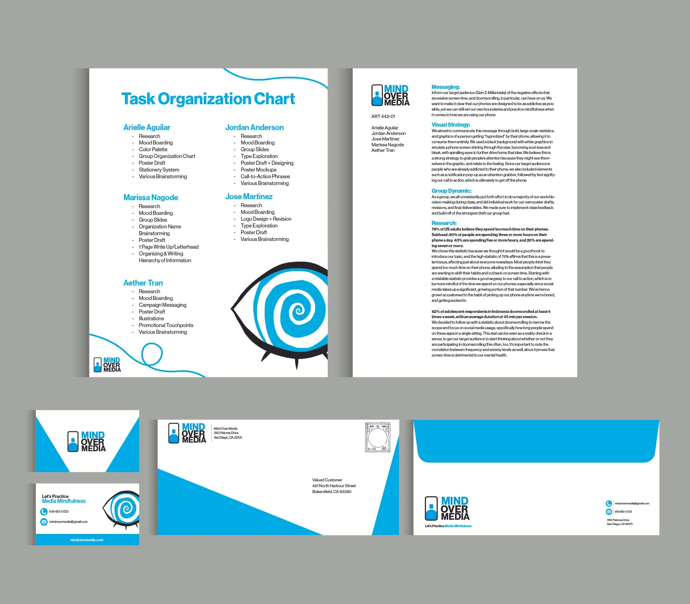 Our stationery system includes a task organization chart, including our team members’ contributions, a letterhead write-up that expands on the process of our campaign and how we arrived at our final solution, a business card, and an envelope