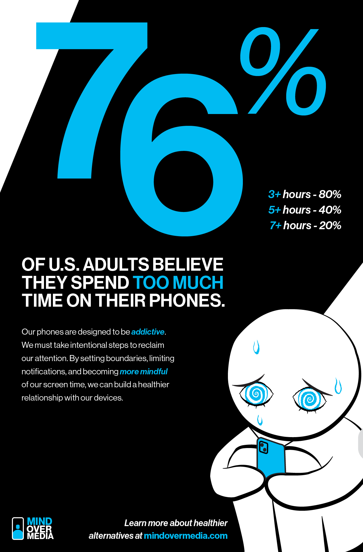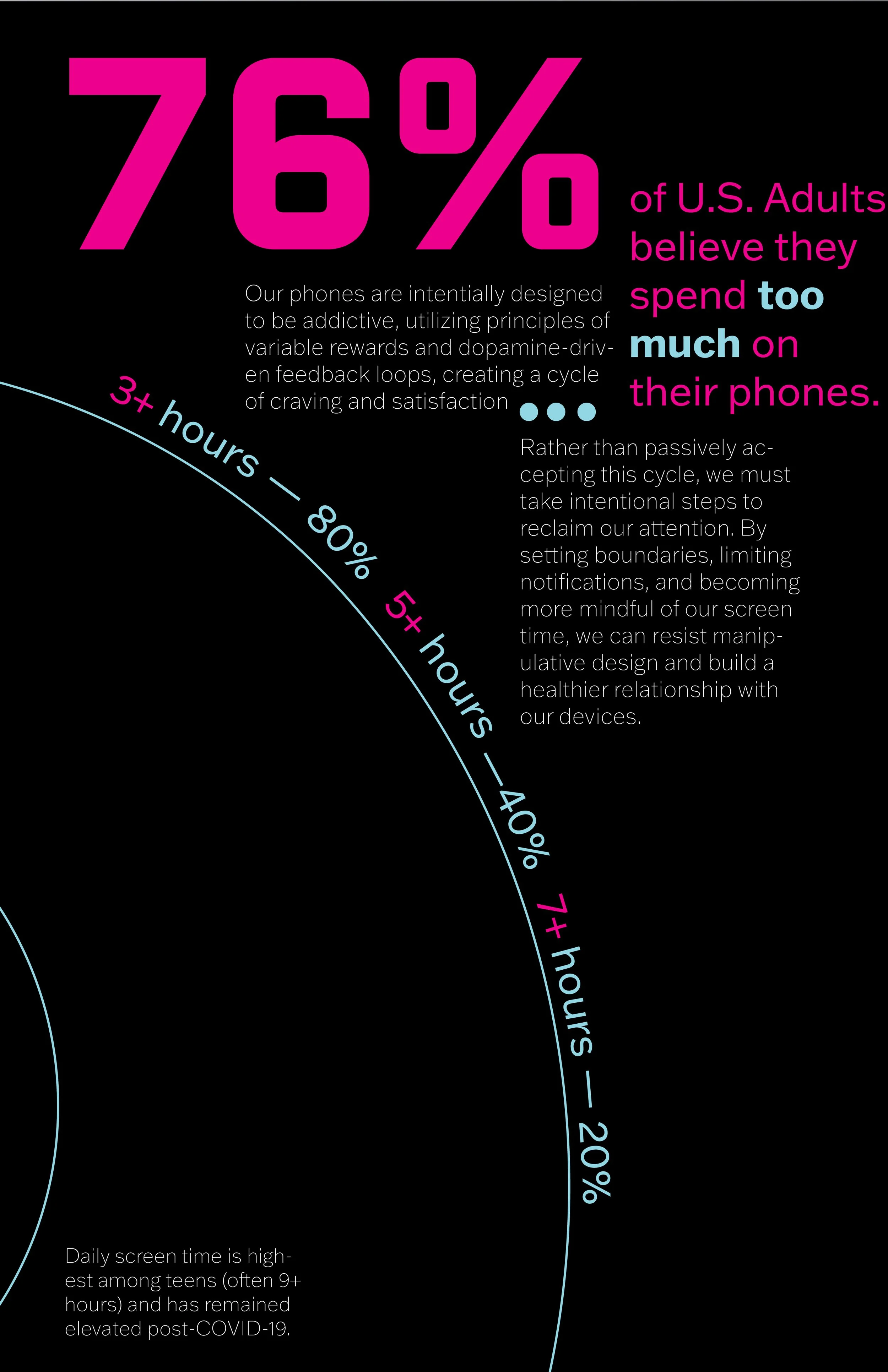 To communicate this message, we used bold, large-scale statistics paired with striking visuals of an individual being “hypnotized” by their phone, symbolizing how easily users can become consumed by digital content. This imagery is intended to be both eye-catching and relatable, encouraging viewers to recognize their own habits in the graphic.